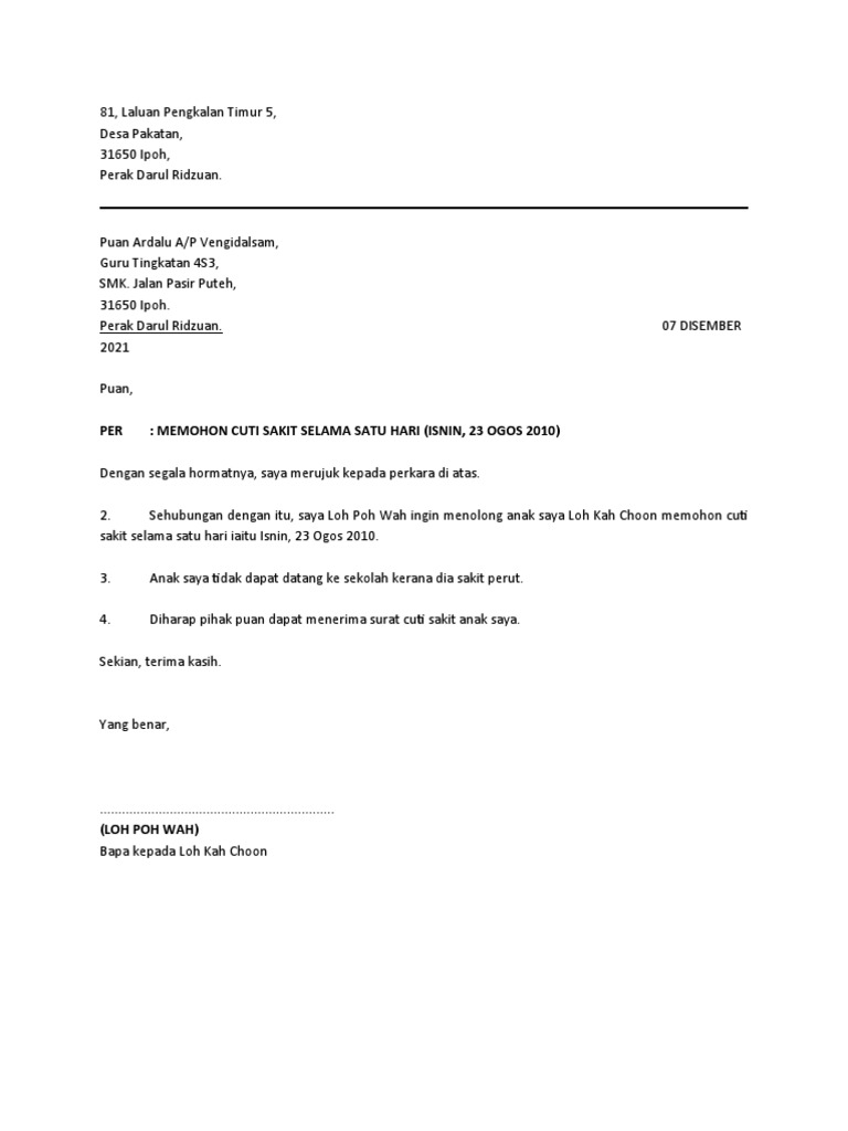 Jika hasil pemeriksaan dokter menganjurkan untuk perawatan intensif atau istirahat selama beberapa hari. Contoh surat cuti karyawan untuk alasan tertentu. Baik itu cuti hari raya, cuti panjang ataupun cuti karena sakit parah. Jika kondisi karyawan memang tidak memungkinkan untuk bekerja, cuti semacam ini memang perlu untuk diajukan. Contoh surat izin sakit tidak masuk sekolah. Berikut adalah contoh surat cuti karena sakit yang bisa dijadikan pedoman. Salah satu alasan yang paling sering ditemukan ketika seorang karyawan ingin meminta cuti tidak masuk kerja atau sekolah adalah dikarenakan sakit. Bagaimana format surat yang tepat agar mempermudah saat melakukan permohonan cuti? Surat permohonan cuti pada dasarnya memang sama saja, namun biasanya tiap instansi memiliki aturan yang rumah sakit umum dr. Brunei fm cuti sakit disahkan sendiri ringkasnya csds. Surat ini adalah dokumen yang berisi tentang permohonan yang dibuat untuk keperluan tertentu, contohnya saja surat permohonan cuti sakit. Contoh surat cuti semacam ini biasanya disertai dengan surat keterangan dari dokter atau rumah sakit apabila diperlukan. Demikian surat izin ini saya buat dengan.
